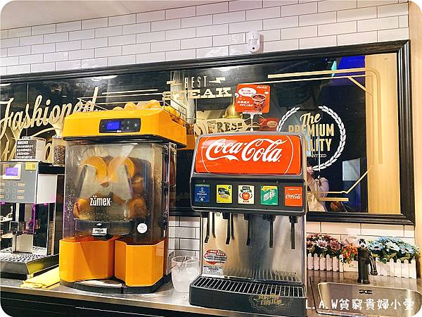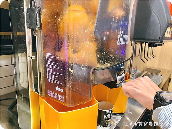然後有洗手台,飲料機跟"現榨柳橙汁"機,這也太酷了吧!!